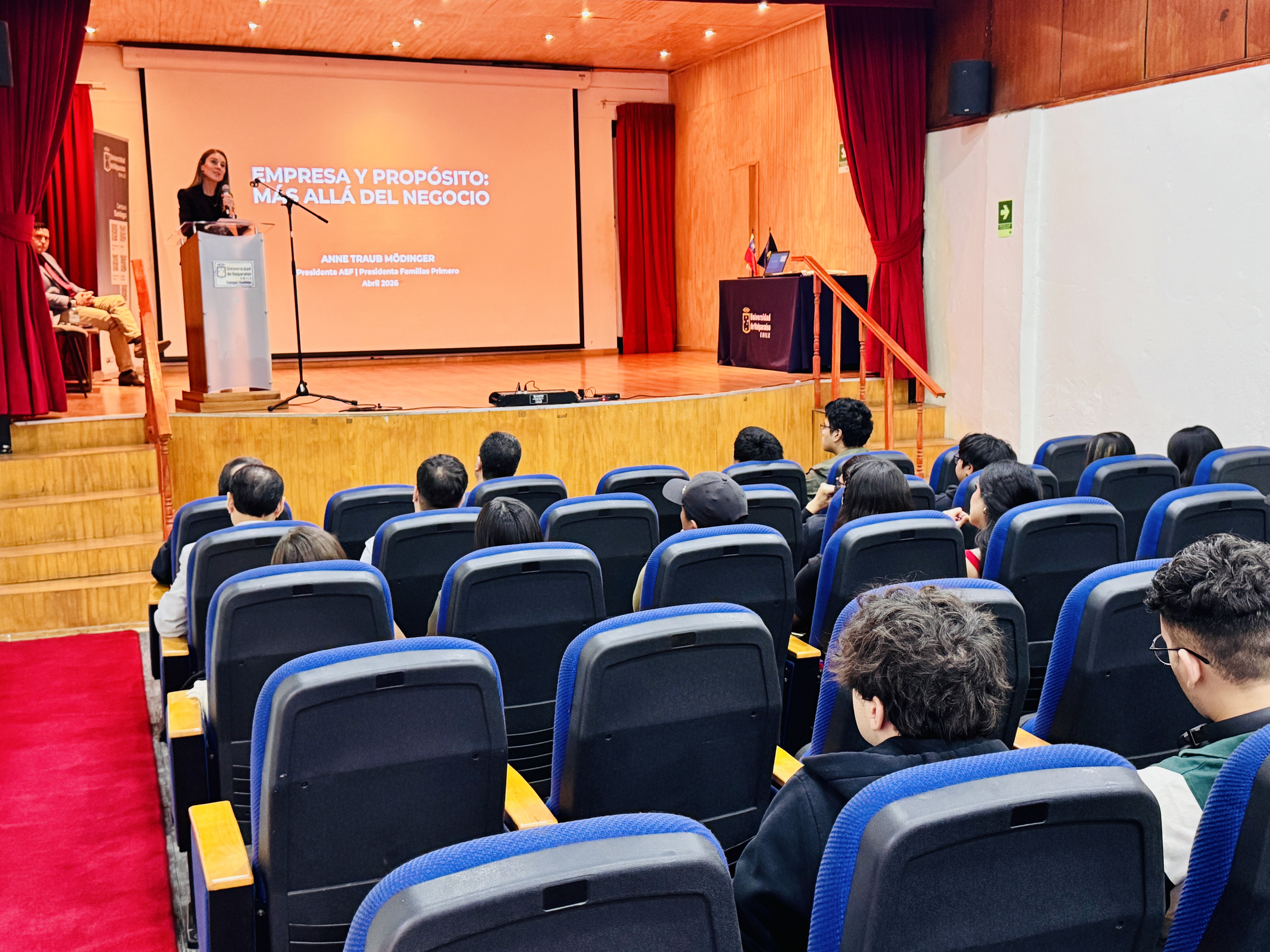 “Si bien las empresas deben avanzar hacia una cultura más filantrópica, también es necesario que todos desarrollemos la conciencia de que la filantropía no es exclusiva de fundaciones ni de altos patrimonios (…). Todos debiéramos comenzar el día pensando cómo podemos hacer un poco más feliz a otra persona”, afirmó Anne Traub Mödinger, presidenta de la Asociación de Empresas Familiares y de Fundación Familias Primero, en el marco de la charla “Empresa y propósito: más allá del negocio”, que se realizó en el teatro del Campus Santiago de la Universidad de Valparaíso.